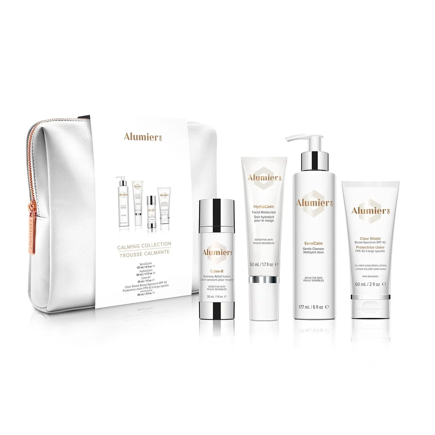 Features four carefully curated, essential home care products to support sensitive and redness-prone skin. They are housed together in a plush, white vegan leather cosmetic bag.