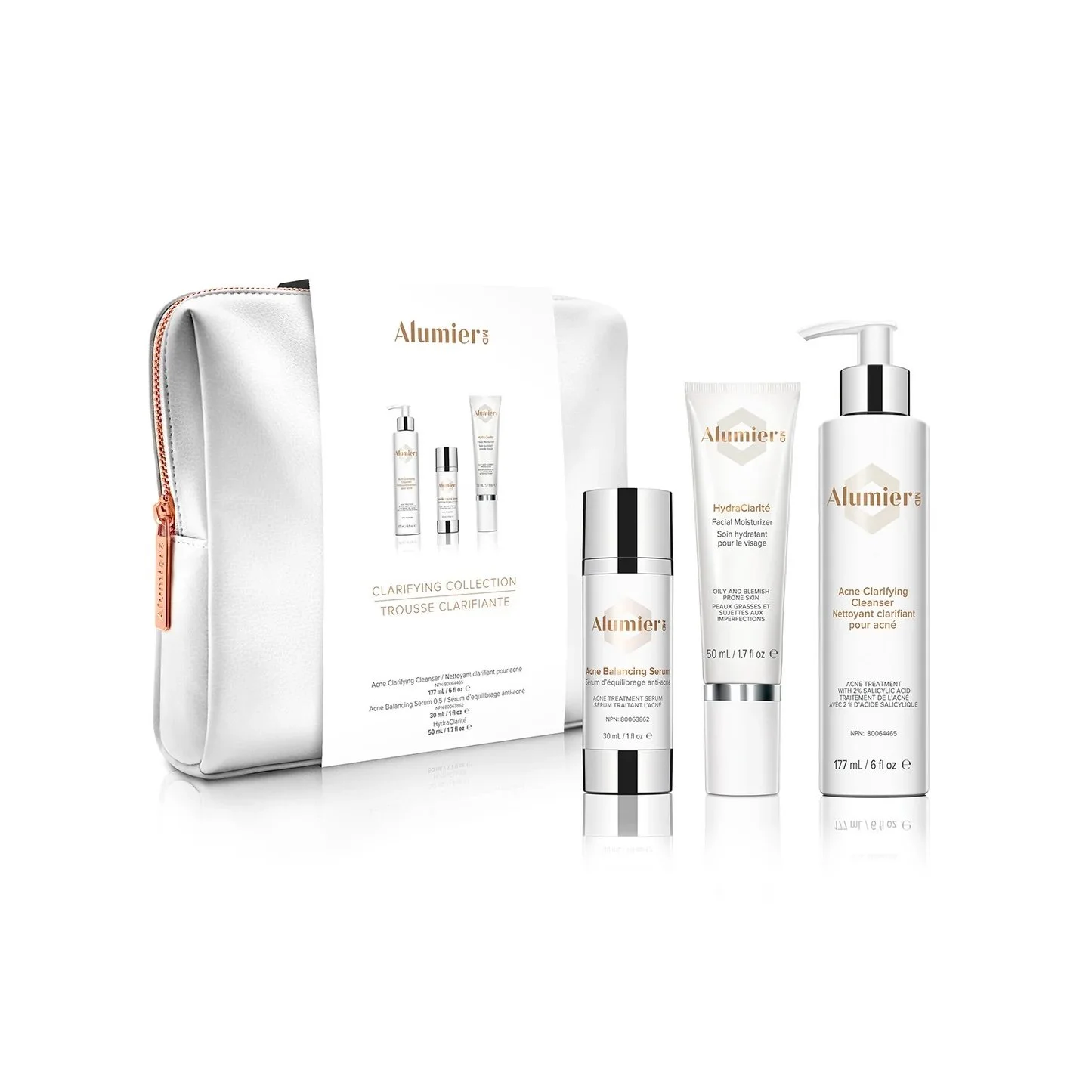Features three carefully curated, essential home care products to support oily and blemish-prone skin. They are housed together in a plush, white vegan leather cosmetic bag.